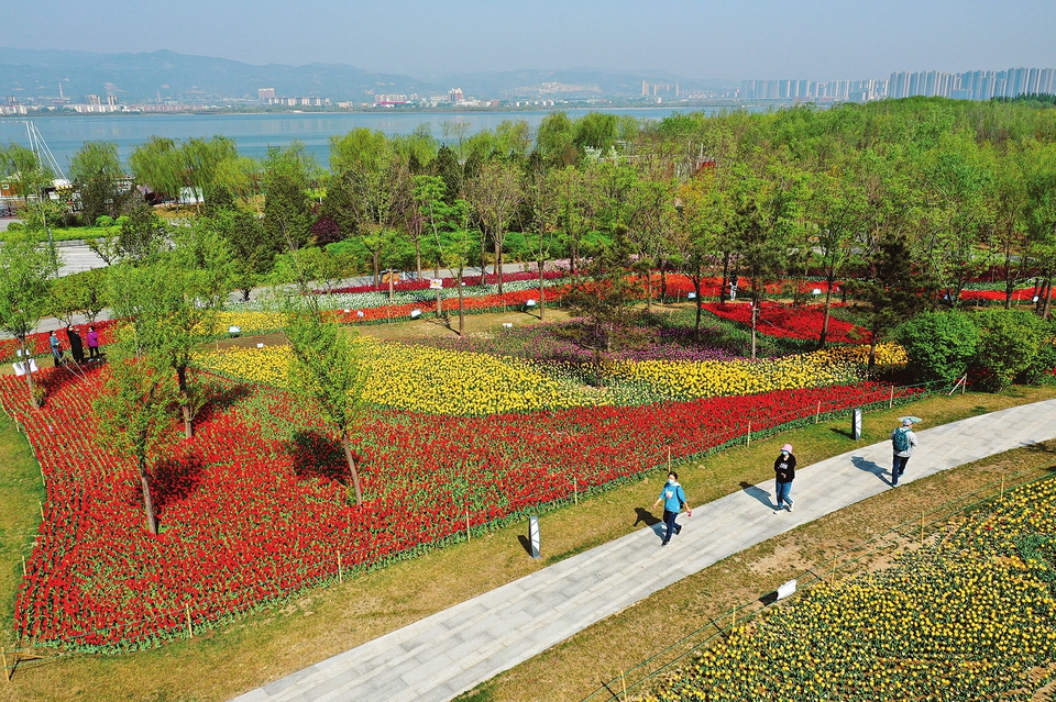 4月20日,太原市晉陽(yáng)湖公園,市民正在參觀郁金香花展。近日,第三屆晉陽(yáng)湖公園郁金香花展啟幕,今年栽種面積1.2萬(wàn)余平方米,70余萬(wàn)株。(記者李兆民攝)