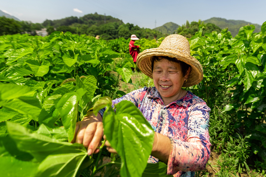 在澧田鎮(zhèn)雙江村蠶桑基地,蠶農(nóng)在采摘桑葉。朱國朝攝