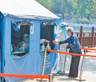 5月4日,北京西城區(qū)什剎海街道荷花市場核酸檢測現(xiàn)場,工作人員引導老人通過綠色通道進行核酸檢測。什剎海街道優(yōu)化點位設置,減少排隊時間。同時特別關注老人、兒童等群體,為他們開辟綠色通道,進一步提高采樣工作效率。