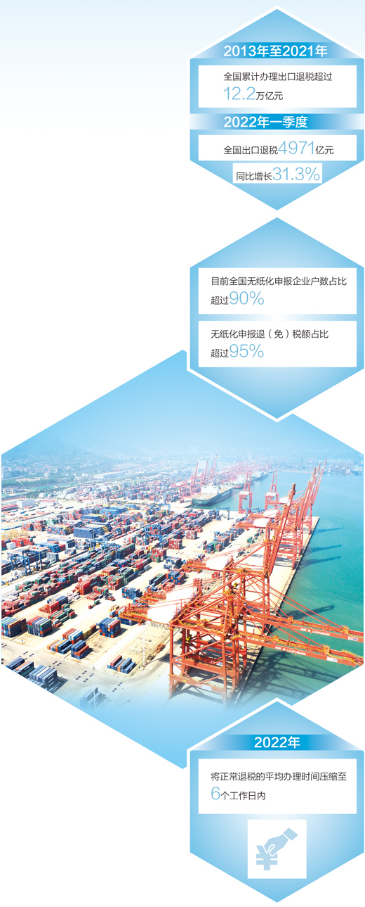 近年來,稅務(wù)總局持續(xù)擴大無紙化申報覆蓋范圍,大幅減輕出口企業(yè)申報負擔(dān)。目前,全國無紙化申報企業(yè)戶數(shù)占比超過90%,無紙化申報退(免)稅額占比超過95%;稅務(wù)總局正會同相關(guān)部門研究推出進一步提高出口退稅便利度等支持舉措,2022年內(nèi),正常退稅的平均辦理時間將壓縮至6個工作日內(nèi)。