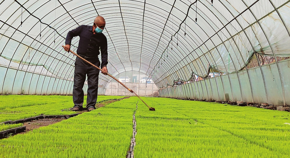 5月14日,太原市晉源區(qū)花塔村育秧基地村民正在護理秧苗。眼下正是農(nóng)忙時節(jié),晉源區(qū)在去年花塔村自動育秧基地的基礎(chǔ)上,新擴建王郭村、北大寺村、稻花城3個育秧基地,優(yōu)選新稻種,擦亮區(qū)域性特色農(nóng)產(chǎn)品品牌。當(dāng)?shù)赜行蚪M織村民推進(jìn)育秧、整地等,滿足全區(qū)3300畝晉祠水稻的插秧需求。(記者李兆民攝)