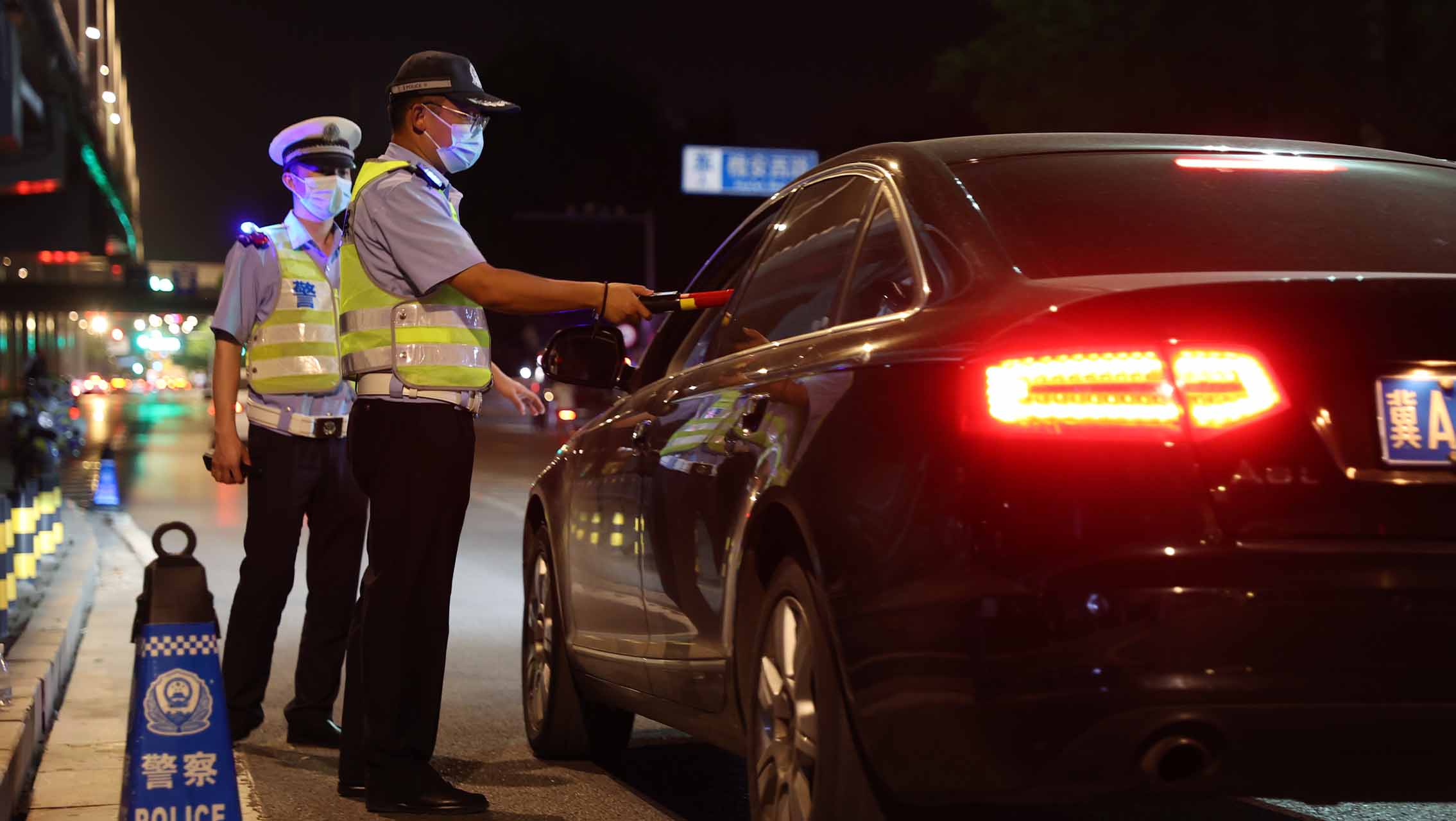 石家莊橋西交警大隊民警在槐安路廣平街口開展酒駕醉駕檢查。 王浩天攝