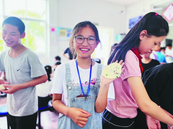 為什么會讓學(xué)生學(xué)做燒餅?zāi)??校長王國寶這樣解釋:“縉云燒餅的制作技藝是國家級非物質(zhì)文化遺產(chǎn),讓學(xué)生傳承這項技藝,也能讓他們感受縉云人記憶深處的味道。六年級的同學(xué)即將畢業(yè),以后他們會離開縉云展翅高飛,真心希望他們能記住縉云燒餅這個回家的路標(biāo)。”