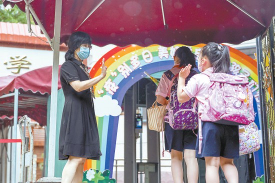 昨天早晨,豐臺區(qū)芳古園小學,因疫情闊別校園多日的小學生返校復(fù)課,老師在校門口歡迎孩子們歸來。本報記者 鄧偉攝
