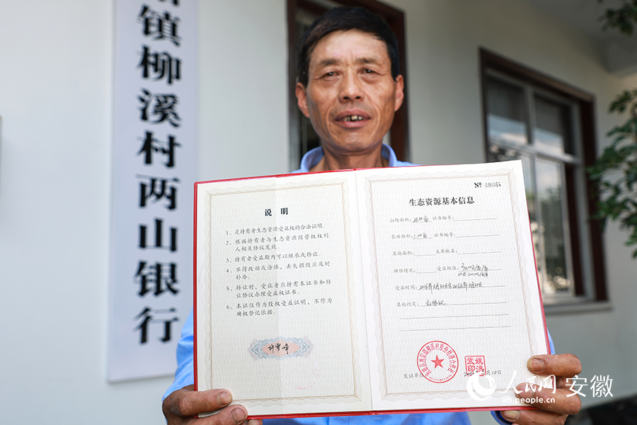 村民許雪峰展示《生態(tài)資源受益權(quán)證》。人民網(wǎng) 張俊攝