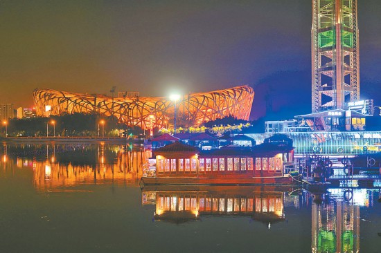 鳥巢北側的月色碼頭霓虹閃爍,濱水而建的月色碼頭已成為一處公園式消夏廣場。本報記者 潘之望攝