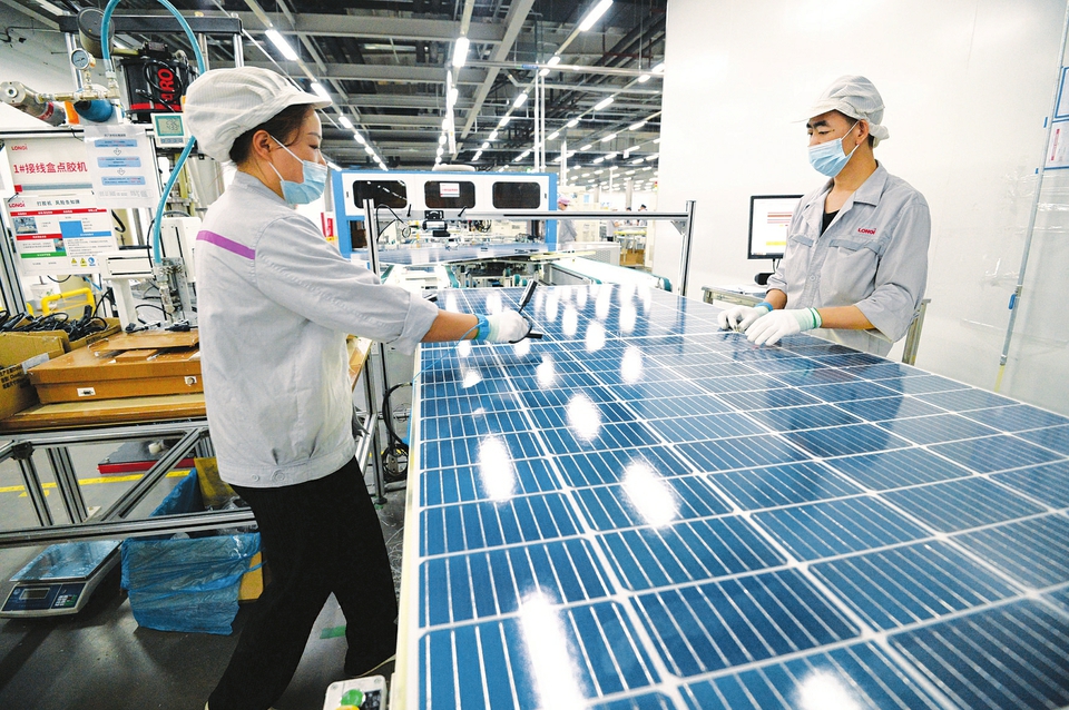 7月15日,大同隆基光伏科技有限公司光伏面板生產(chǎn)線(xiàn)上,工人們正在對(duì)產(chǎn)品進(jìn)行最后檢測(cè)。該公司規(guī)劃布局了3條自動(dòng)化生產(chǎn)線(xiàn),引入目前行業(yè)內(nèi)先進(jìn)的生產(chǎn)設(shè)備和技術(shù)工藝。全部建成投產(chǎn)后,預(yù)計(jì)年產(chǎn)值約30億元。(記者李兆民攝)