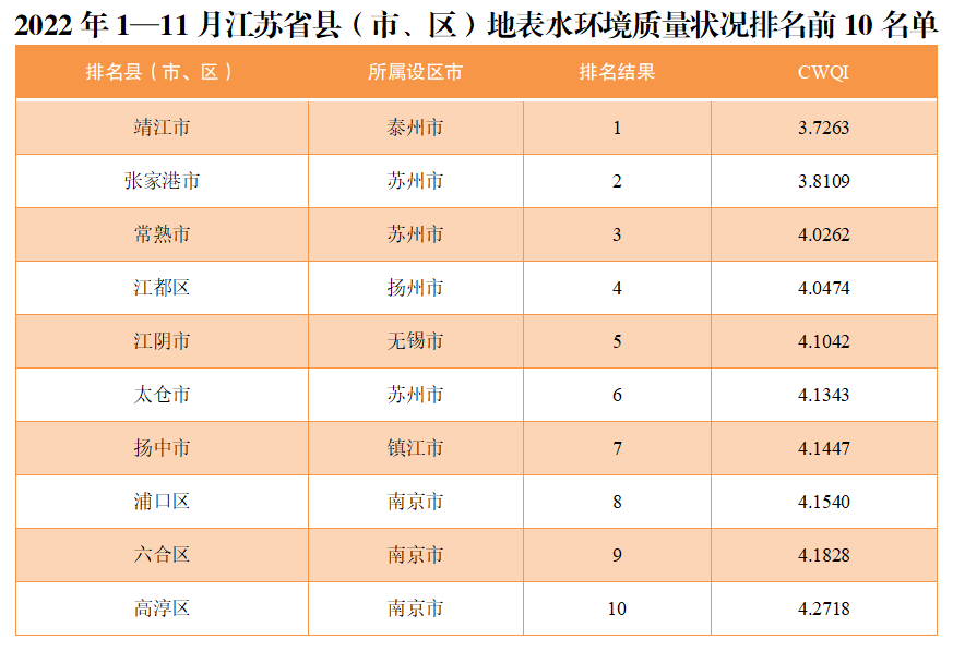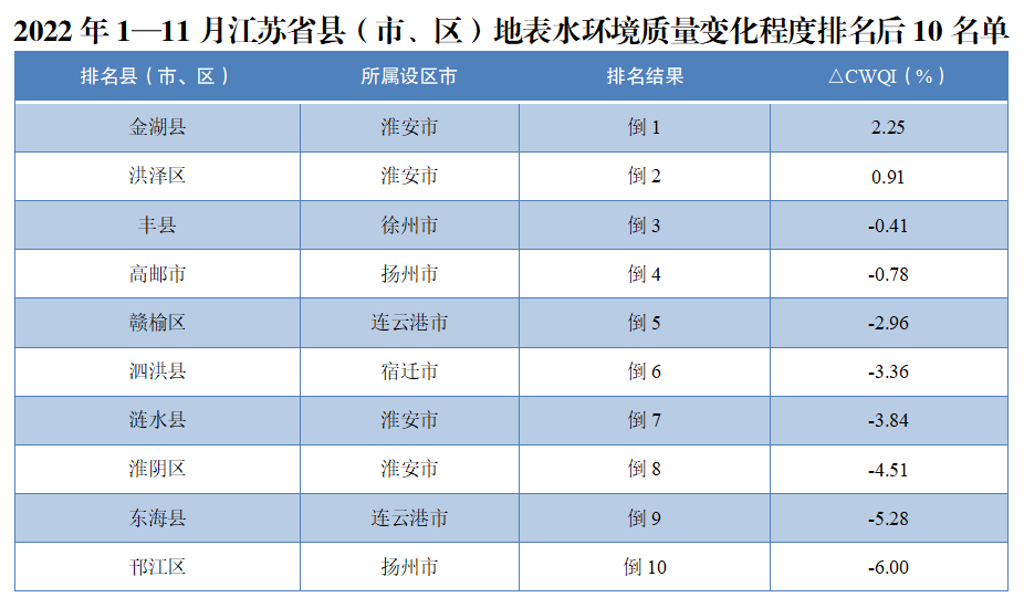 具體看來,2022年1—11月,63個縣(市、區(qū))中,地表水環(huán)境質(zhì)量相對較好的前10位(1—10名)依次是靖江市、張家港市、常熟市、江都區(qū)、江陰市、太倉市、揚中市、浦口區(qū)、六合區(qū)、高淳區(qū)。相對較差的后10位(倒1—10名)依次是銅山區(qū)、漣水縣、豐縣、泗洪縣、東??h、贛榆區(qū)、洪澤區(qū)、沭陽縣、金湖縣、淮陰區(qū)。