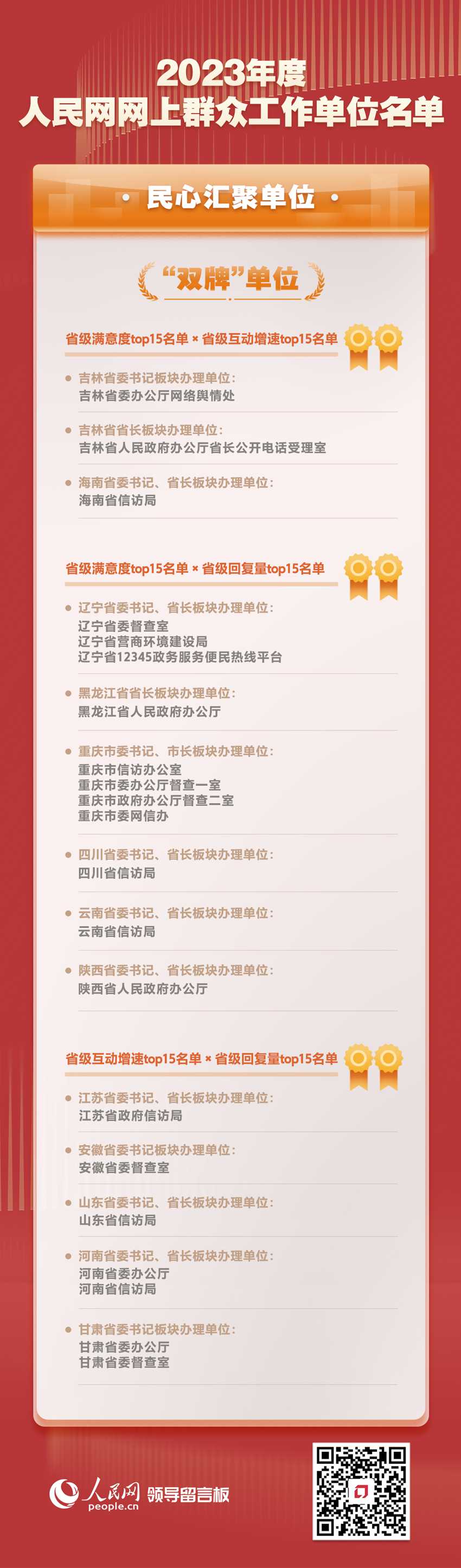 此次公布的名單綜合全國(guó)各地區(qū)各部門各單位近一年來(lái)的滿意度、互動(dòng)增速、回復(fù)量等指數(shù),著重突出各地區(qū)各部門各單位依托人民網(wǎng)“領(lǐng)導(dǎo)留言板”開(kāi)展網(wǎng)上群眾工作情況,選出2023年度人民網(wǎng)網(wǎng)上群眾工作“民心匯聚單位”“實(shí)干擔(dān)當(dāng)單位”“匯智為民單位”和“活力奮進(jìn)單位”。