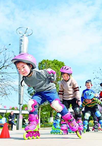 浙江省臺州市仙居縣一公園,小朋友在學習輪滑。王華斌攝/光明圖片