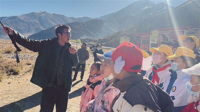 小朋友們在保護中心工作人員李義旺的帶領下了解雪豹生存環(huán)境。