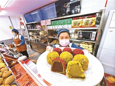 寒食節(jié)有踏青出游、放風(fēng)箏等民俗活動(dòng),護(hù)國(guó)寺小吃“寒食十三絕”中的蜜麻花,形似風(fēng)箏,有著寒食吃蜜麻花耳聰目明的寓意;而像姜汁排叉,在春寒尚未退卻之時(shí),以姜汁暖胃,加之春季宜食甜,所以也成為護(hù)國(guó)寺小吃寒食中的銷量冠軍。在護(hù)國(guó)寺小吃起源店,為了方便市民購(gòu)買,護(hù)國(guó)寺小吃的“寒食十三絕”堅(jiān)持套裝售賣和零售,經(jīng)理王新梅介紹,“像里面的姜汁排叉、蜜麻花的銷量幾乎能占到十三絕銷量的四成左右,最受歡迎?!?/p>
