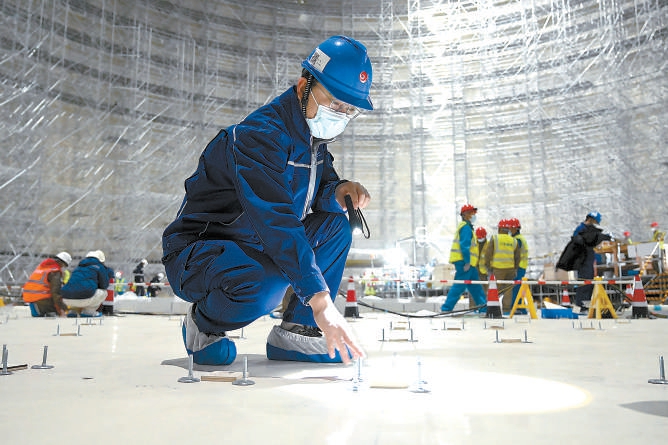 項目部職工在薄膜罐內(nèi)檢查螺柱安裝情況。 北京燃氣集團供圖