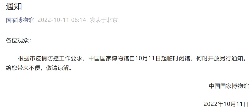 央廣網(wǎng)北京10月11日消息 據(jù)國家博物館官方微信公眾號消息,根據(jù)北京市疫情防控工作要求,中國國家博物館自10月11日起臨時閉館,何時開放另行通知。