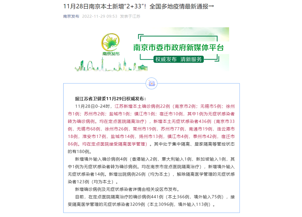 11月28日江蘇新增本土確診22例 新增本土無(wú)癥狀436例