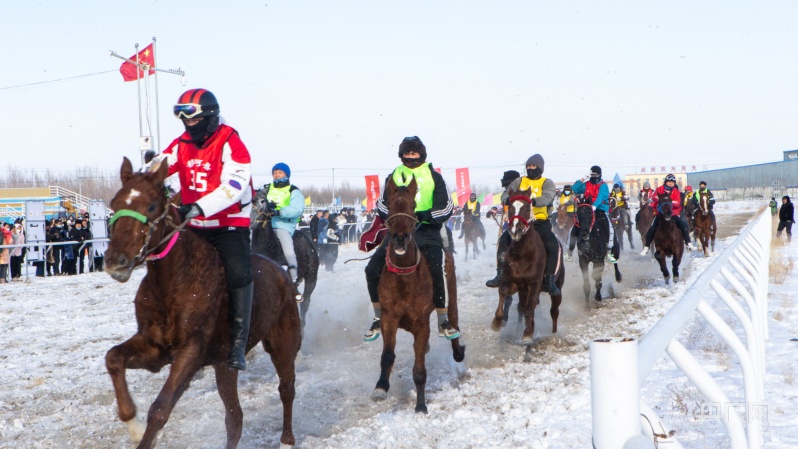 “馬匹就位,預備……”隨著裁判一聲令下,騎手們駕馭的賽馬如離弦之箭,爭先恐后奔騰而過,雪地上馬蹄聲聲、雪花飛揚。參賽選手揮舞韁繩,策馬揚鞭,像一陣疾風掠過,盡情地在賽道上體驗著激情與速度。緊張刺激的比賽贏得觀眾的一片歡呼,大家紛紛拿出手機拍照,用鏡頭記錄下精彩的瞬間,現(xiàn)場歡呼聲、助威聲不絕于耳,把比賽氣氛推向了高潮。