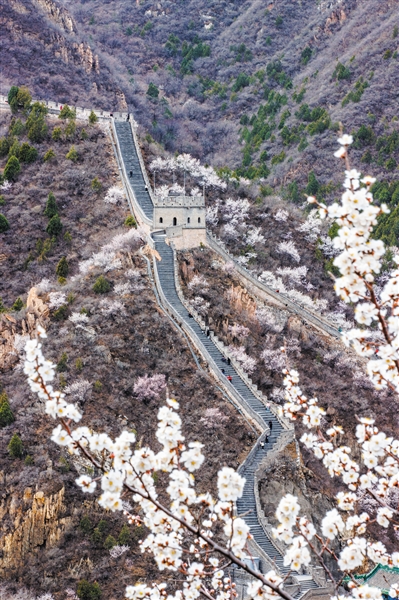 3月24日,居庸關(guān)長城與山花爛漫同框。新京報記者 王子誠 攝