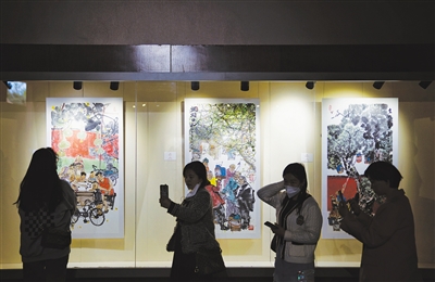 4月5日,游客在景山公園看《印象中軸 京城記憶——紫禁之巔系列馬海方書畫藝術(shù)展》。新京報記者 薛珺 攝
