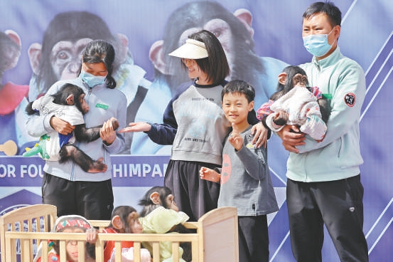 16日,北京野生動(dòng)物園在萌寶幼兒園戶外展區(qū)組織“明猩見(jiàn)面會(huì)”活動(dòng),邀約忠實(shí)粉絲與四只小黑猩猩互動(dòng)合影。本報(bào)記者 鄧偉攝