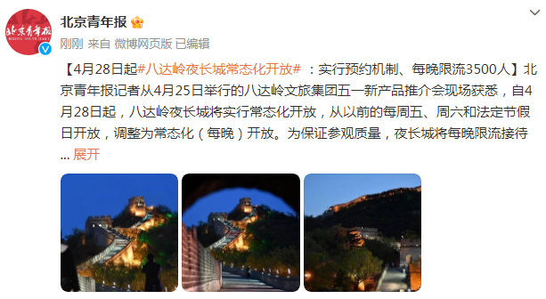 4月28日起八達(dá)嶺夜長(zhǎng)城常態(tài)化開放:實(shí)行預(yù)約機(jī)制、每晚限流3500人