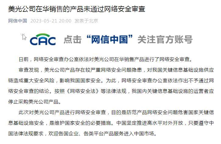 審查發(fā)現(xiàn),美光公司產(chǎn)品存在較嚴(yán)重網(wǎng)絡(luò)安全問題隱患,對(duì)我國關(guān)鍵信息基礎(chǔ)設(shè)施供應(yīng)鏈造成重大安全風(fēng)險(xiǎn),影響我國國家安全。為此,網(wǎng)絡(luò)安全審查辦公室依法作出不予通過網(wǎng)絡(luò)安全審查的結(jié)論。按照《網(wǎng)絡(luò)安全法》等法律法規(guī),我國內(nèi)關(guān)鍵信息基礎(chǔ)設(shè)施的運(yùn)營者應(yīng)停止采購美光公司產(chǎn)品。