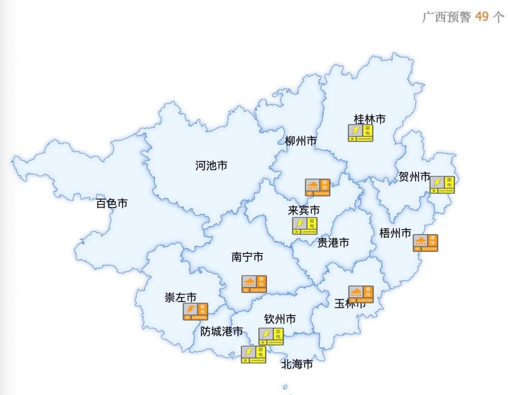今天(24日),廣西南寧、梧州、玉林等地相繼發(fā)布暴雨、雷電等各類氣象預警信息,提醒公眾注意做好相關防范工作。截至24日上午9點30分,全區(qū)各類預警信息49個。