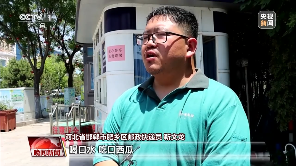 河北省邯鄲市肥鄉(xiāng)區(qū)郵政快遞小哥 靳文龍:多虧了這個愛心警亭,在這里避避暑,喝口水,吃塊西瓜,涼滋滋的。