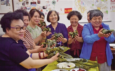 6月19日下午,什剎海街道端午節(jié)民俗活動(dòng)在北京市西城區(qū)什剎海街道華方居家養(yǎng)老配餐中心舉行,30多位老人和民俗專家一起包粽子。新京報(bào)記者 李木易 攝