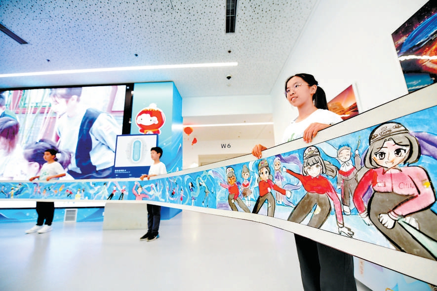 府學(xué)胡同小學(xué)的同學(xué)在“冰絲帶”展示了自己參與實(shí)踐課程后,運(yùn)用所學(xué)知識繪制的長卷。本報(bào)記者 和冠欣攝