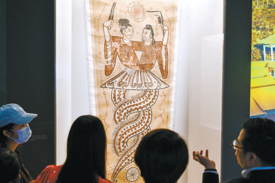 “交融匯聚——新疆精品歷史文物展”近日在國(guó)家博物館開幕。展覽展出新疆精品歷史文物209件(組),展現(xiàn)新疆各民族交往交流交融的歷史事實(shí)。圖為觀眾欣賞伏羲女媧絹畫。 本報(bào)記者 鄧偉攝