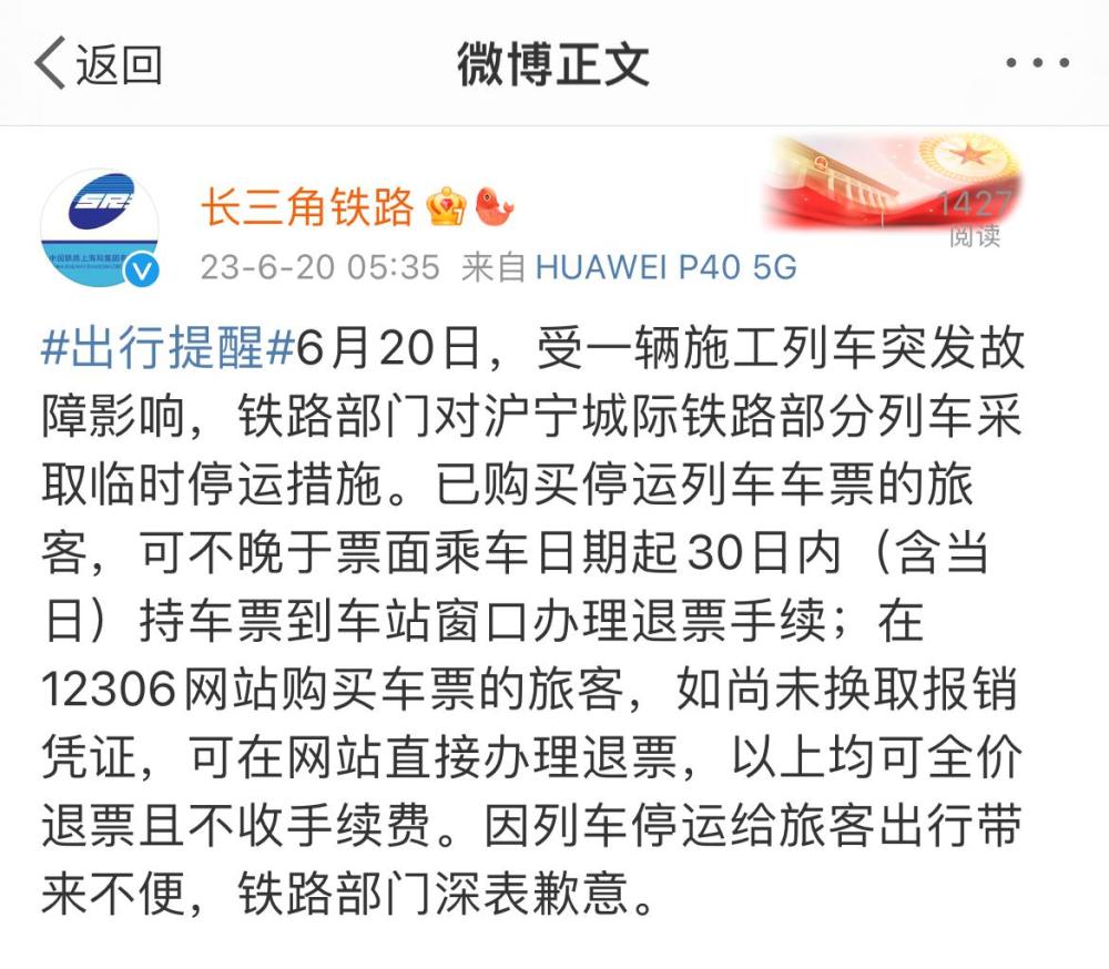 記者6月20日從鐵路上海局獲悉,受一輛施工列車(chē)突發(fā)故障影響,鐵路部門(mén)對(duì)滬寧城際鐵路部分列車(chē)采取臨時(shí)停運(yùn)措施。已購(gòu)買(mǎi)停運(yùn)列車(chē)車(chē)票的旅客,可不晚于票面乘車(chē)日期起30日內(nèi)(含當(dāng)日)持車(chē)票到車(chē)站窗口辦理退票手續(xù);在12306網(wǎng)站購(gòu)買(mǎi)車(chē)票的旅客,如尚未換取報(bào)銷(xiāo)憑證,可在網(wǎng)站直接辦理退票,以上均可全價(jià)退票且不收手續(xù)費(fèi)。