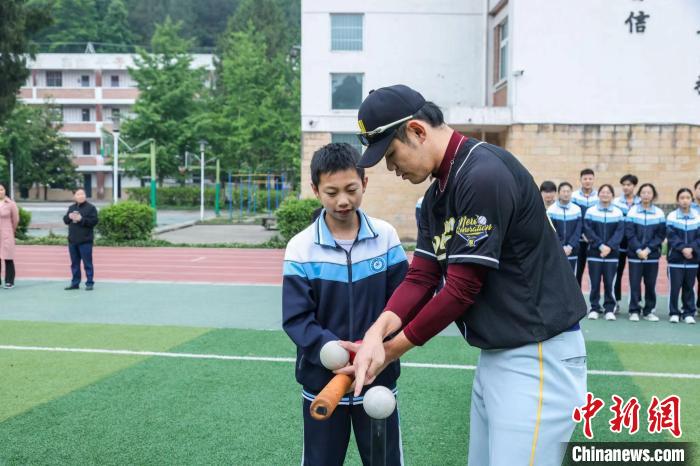今年4月,臺青宋奇軒在北京合伙創(chuàng)辦“新世代棒球俱樂部”。圖為宋奇軒在四川省青川縣為當(dāng)?shù)貙W(xué)校開展公益棒球課項目。(受訪者供圖)