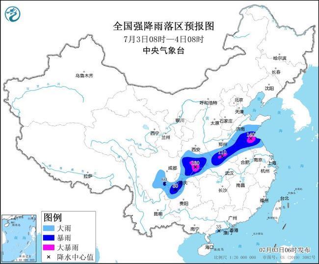 預(yù)計(jì),7月3日08時(shí)至4日08時(shí),山東中南部、江蘇北部、安徽北部、河南東部和南部、湖北北部和西部、陜西南部、重慶、四川東部、貴州西北部、云南東北部以及廣東西南部沿海等地部分地區(qū)有大到暴雨,其中,山東南部、江蘇北部、河南南部、重慶北部、四川東北部等地局地有大暴雨(100~160毫米)。上述部分地區(qū)伴有短時(shí)強(qiáng)降水(最大小時(shí)降雨量30~50毫米,局地可超過60毫米),局地有雷暴大風(fēng)等強(qiáng)對(duì)流天氣。