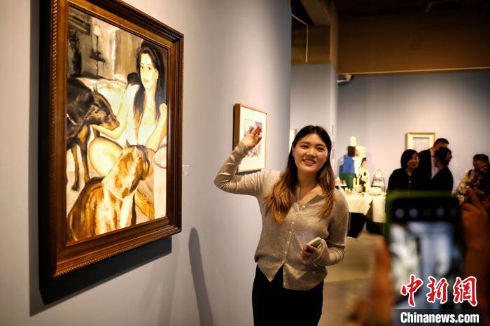 6月底,于飛在北京舉辦個人藝術(shù)展“啟程”。圖為于飛向觀眾介紹展出作品。 中新社記者 李雪峰 攝
