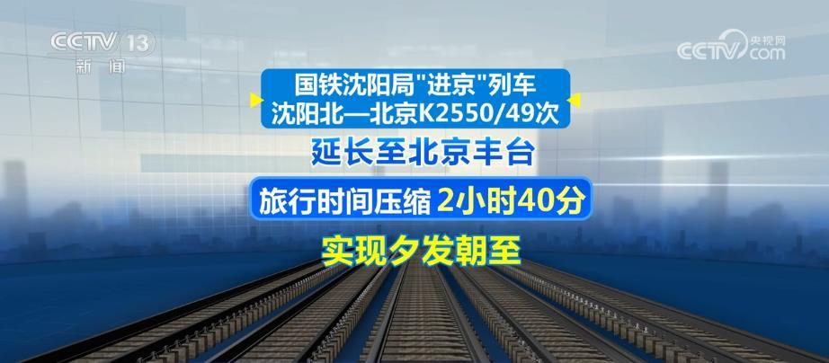 此次調(diào)圖,國鐵沈陽局“進(jìn)京”列車沈陽北—北京K2550/49次延長至北京豐臺(tái),旅行時(shí)間壓縮2小時(shí)40分,實(shí)現(xiàn)夕發(fā)朝至。