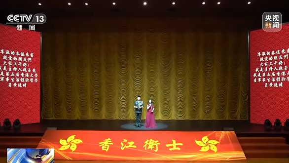 《香江衛(wèi)士》主題文藝演出舞臺(tái)上,身著紅色禮服的香港女孩黃逸晴與駐軍官兵同臺(tái)主持。黃逸晴是2015年香港大學(xué)生軍事生活體驗(yàn)營(yíng)的學(xué)員,大學(xué)畢業(yè)后,她經(jīng)常從事社會(huì)公益工作,把愛(ài)國(guó)精神、奉獻(xiàn)情懷傳遞給更多人。