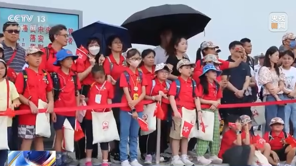 上午10時(shí),在昂船洲軍營(yíng),駐香港部隊(duì)三軍儀仗隊(duì)邁著鏗鏘有力的步伐護(hù)旗而出,伴隨著雄壯的《義勇軍進(jìn)行曲》,青少年們與解放軍官兵一起升國(guó)旗、唱國(guó)歌。在隨后的軍事課目表演中,突降大雨,官兵們頂著暴雨為現(xiàn)場(chǎng)觀眾展示了軍樂(lè)隊(duì)列、格斗技術(shù)、刺殺操、獵人戰(zhàn)斗等課目。