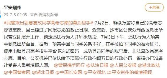 7月2日,湖北荊州,一女生報(bào)警稱(chēng)自己的高考志愿被篡改,且已經(jīng)過(guò)了網(wǎng)報(bào)志愿的截止日期。受案后,沙市區(qū)公安分局西區(qū)派出所民警立即展開(kāi)工作,鎖定違法行為人并積極勸投。