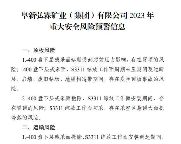 2023年1月,阜新市煤炭工業(yè)轉(zhuǎn)型發(fā)展局發(fā)布阜新市平安礦業(yè)有限責(zé)任公司和阜新弘霖礦業(yè)(集團)有限公司2023年重大安全風(fēng)險預(yù)警信息。其中提及,阜新弘霖礦業(yè)(集團)有限公司涉及運輸風(fēng)險、火災(zāi)風(fēng)險、瓦斯風(fēng)險、爆炸風(fēng)險等。(完)