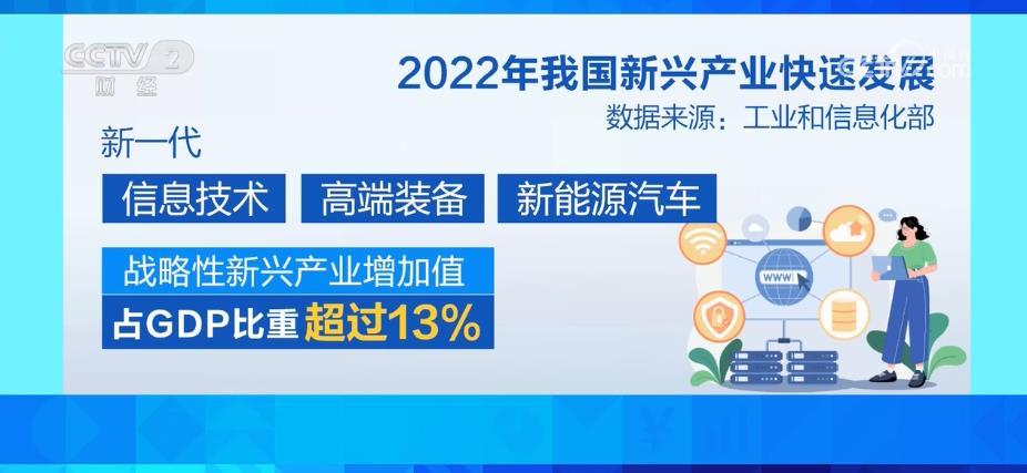 工業(yè)和信息化部部長金壯龍介紹,2022年,我國新一代信息技術、高端裝備、新能源汽車等戰(zhàn)略性新興產(chǎn)業(yè)增加值占GDP比重超過13%。