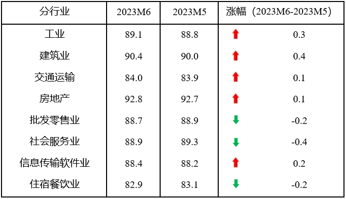 具體來看,6月份,8個分行業(yè)指數(shù)5升3降,工業(yè)、建筑業(yè)、交通運輸郵政倉儲業(yè)、房地產(chǎn)業(yè)和信息傳輸計算機服務(wù)軟件業(yè)指數(shù)分別上升0.3、0.4、0.1、0.1和0.2點,而批發(fā)零售業(yè)、社會服務(wù)業(yè)和住宿餐飲業(yè)指數(shù)分別下降0.2、0.4和0.2點。由此可見,工業(yè)和建筑業(yè)指數(shù)開始回升;而服務(wù)業(yè)指數(shù)的上漲勢頭出現(xiàn)回調(diào)。