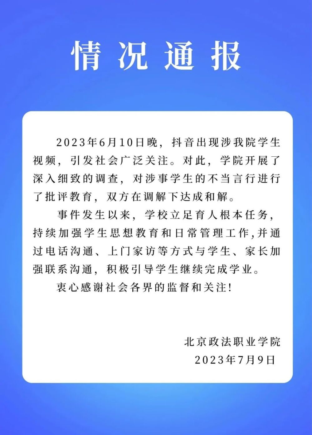 同時(shí),據(jù)北京政法職業(yè)學(xué)院,6月10日晚,抖音出現(xiàn)涉該院學(xué)生視頻,引發(fā)社會(huì)廣泛關(guān)注。對(duì)此,學(xué)院開(kāi)展了深入細(xì)致的調(diào)查,對(duì)涉事學(xué)生的不當(dāng)言行進(jìn)行了批評(píng)教育,雙方在調(diào)解下達(dá)成和解。