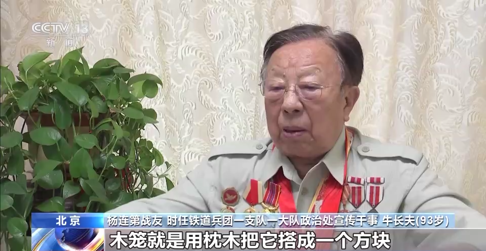 楊連第戰(zhàn)友 時任鐵道兵一支隊一大隊政治處宣傳文化干事 牛長夫:當時給把橋梁炸毀了,我們上哪弄梁去,楊連第(想了)一個很絕妙的辦法,就是木籠加木排。木籠就是用的枕木把它搭成一個方塊,里面投上石頭,作為橋梁的基礎,上面再架排架,扣上鋼軌,這樣就可以維持通車了。楊連第一個多星期,就在水里面泡著。