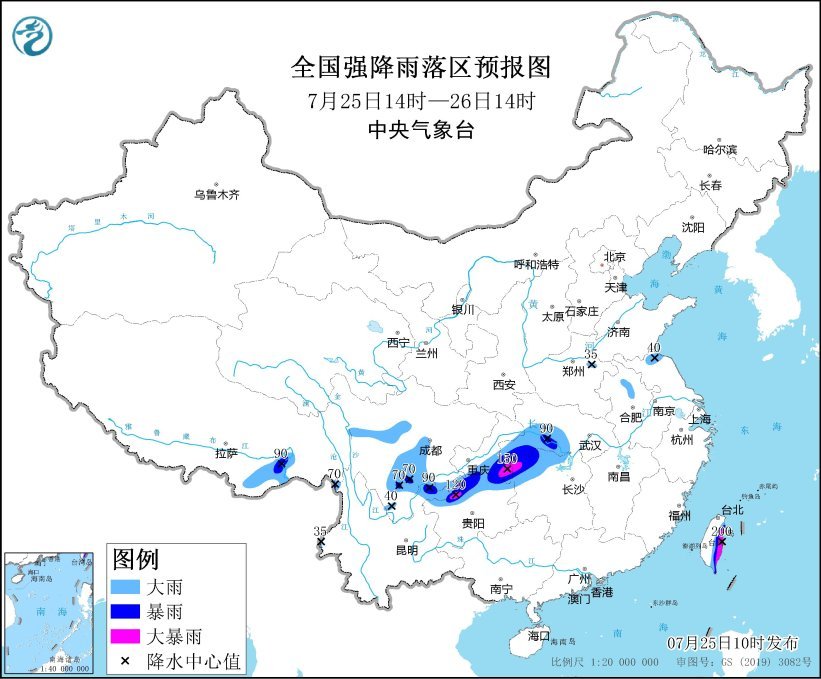 預(yù)計(jì),7月25日14時(shí)至26日14時(shí),西藏東南部、云南西部和東北部、四川西部和南部、貴州北部、重慶東部、湖北西南部、湖南西北部以及臺灣島東部等地有大到暴雨,其中,貴州西北部、重慶東南部、湖南西北部和臺灣島東部等地的部分地區(qū)有大暴雨(100~200毫米);上述部分地區(qū)伴有短時(shí)強(qiáng)降水(最大小時(shí)降雨量20~50毫米,局地可超過80毫米),局地有雷暴大風(fēng)等強(qiáng)對流天氣。
