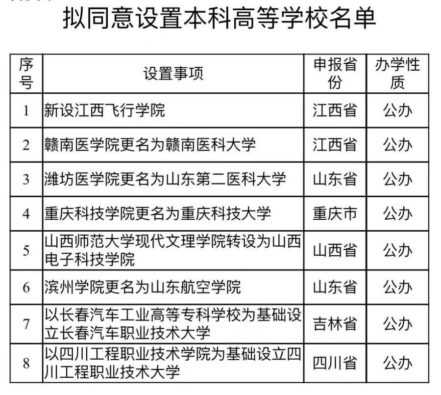 央廣網(wǎng)北京11月8日消息(記者 馮儀) 近日,教育部根據(jù)《中華人民共和國高等教育法》《普通高等學校設置暫行條例》《普通本科學校設置暫行規(guī)定》《本科層次職業(yè)學校設置標準(試行)》有關規(guī)定以及第八屆全國高等學校設置評議委員會考察評議結果,擬同意設置江西飛行學院等8所學校。