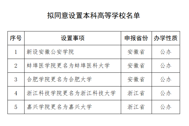 本次擬設(shè)置本科高校中,1所高校為新設(shè),4所本科高校更名。具體名單如下: