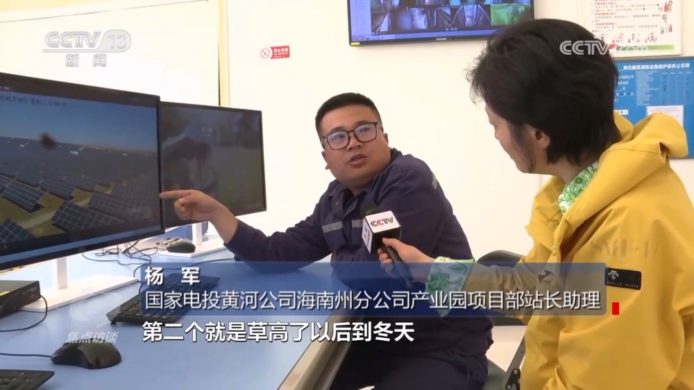 國家電投黃河公司海南州分公司產(chǎn)業(yè)園項目部站長助理楊軍:“光伏板下面這些羊,就是我們請過來幫忙除草的。因為每年一到夏天,園區(qū)電池組件下面草就特別高,長高了以后會遮擋電池組件,一個是影響發(fā)電效率,再一個秋冬季有火災隱患?!?/p>