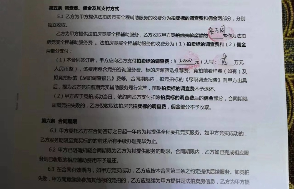 最終,中介口中30萬出頭就可以拿下的房子,被加價(jià)到了39萬,李先生放棄了競拍。他算了一筆賬,按最終成交價(jià)再加上各種費(fèi)用,這套法拍房不低于同戶型的二手房價(jià)格。房子沒拍到,之前交的兩萬元“調(diào)查費(fèi)”也打了水漂。在李先生給記者提供的雙方合同中,有這樣的約定:“合同期限內(nèi),擬競拍標(biāo)的《盡職調(diào)查報(bào)告》向甲方出具后,視為乙方競拍前期競買輔助服務(wù)履行完畢,前期拍賣標(biāo)的‘調(diào)查費(fèi)’不予退還”。