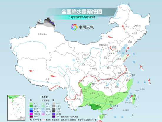 具體來看,今天新疆北疆北部、山東半島等地有小到中雪或雨夾雪,其中新疆阿勒泰、塔城的部分地區(qū)有大到暴雪,局地大暴雪(20~24毫米);四川盆地南部、貴州、江南南部和東部、華南、臺(tái)灣島等地有小雨,其中廣西南部等地的部分地區(qū)有中雨。