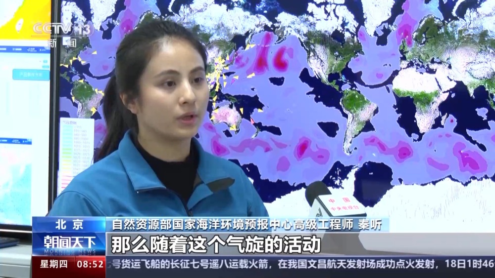 自然資源部國(guó)家海洋環(huán)境預(yù)報(bào)中心高級(jí)工程師 秦聽:那么隨著這個(gè)氣旋的活動(dòng),就會(huì)造成這種南半球的中低緯度的暖濕氣流,與南極的冷氣團(tuán)之間的碰撞,所形成的這種極地的降雪,以及海霧這種低能見度的一個(gè)情況,并且會(huì)引起它作業(yè)海區(qū)的一個(gè)大風(fēng)、海浪的這種高海況天氣。